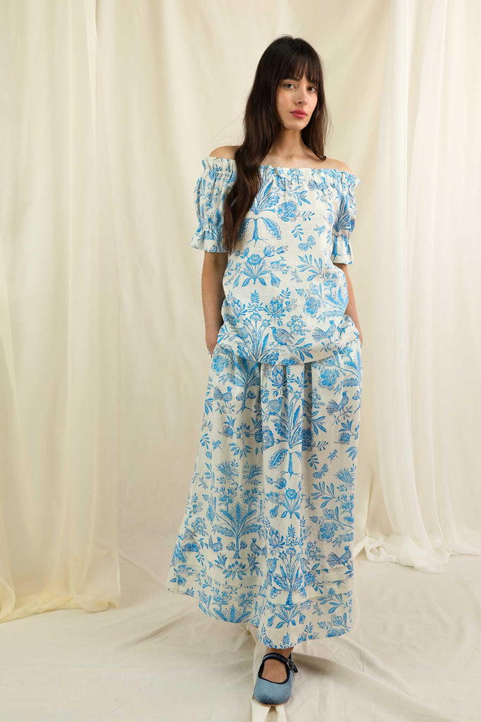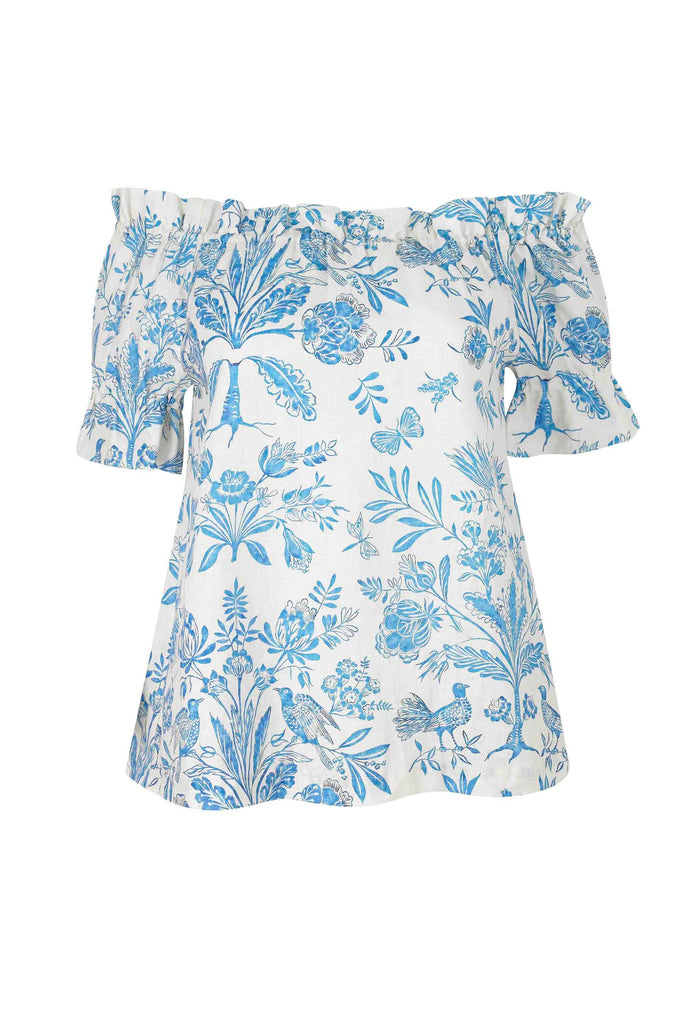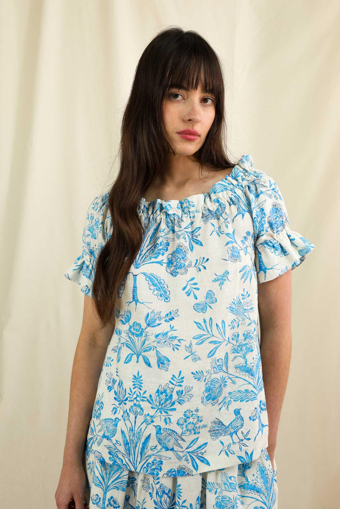 A short sleeve blouse with a frill trim along the top to beautifully frame your shoulders and collarbones. This sweet blouse is loose fitting and perfectly styled tucked into the matching Bushka skirt.