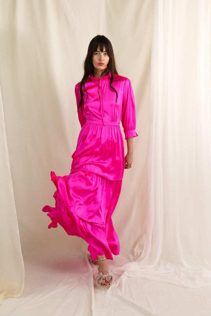 Dance the night away in this stunning maxi dress with a gorgeous, flowing 3-tier skirt inspired by Señorita dresses; made for dancing in. The vibrant, hot pink hue is sure to turn heads at all your parties this wedding season.
