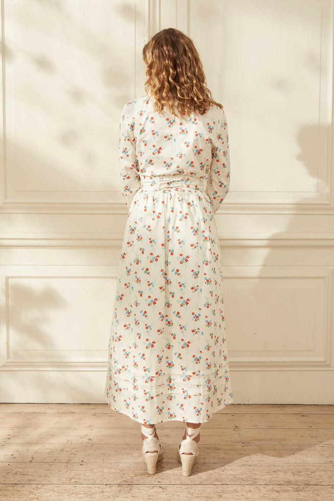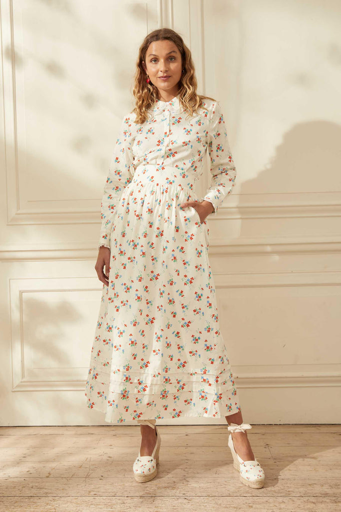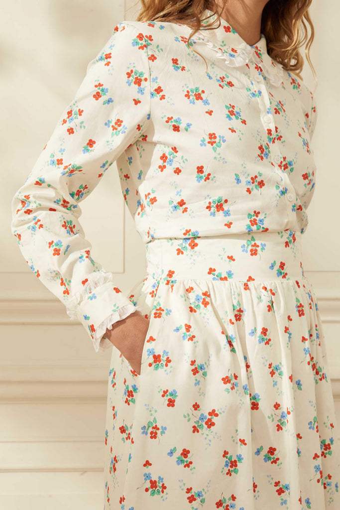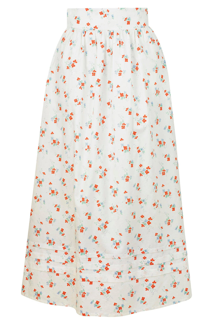 A profusion of painterly petals lend an oh-so playful feel to the joyous, ankle-skimming blossom printed Bushka Skirt. This pleated cotton sateen style sits high on the waist, finished with an elasticated waistband and a corseted scallop bow detail.
