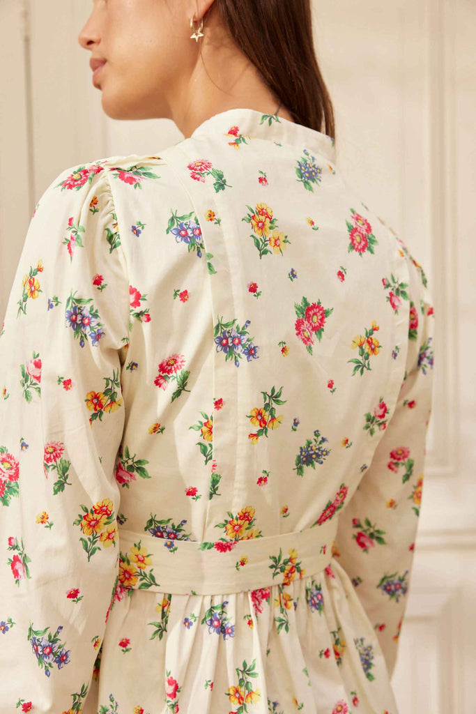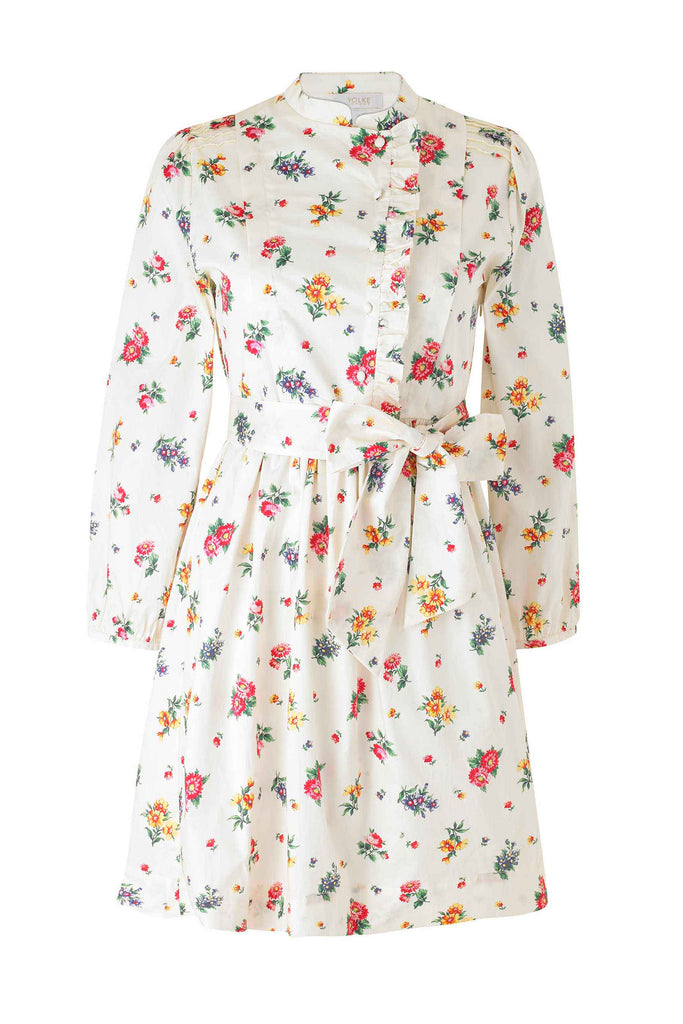 This ivory based floral mini dress is cut with gently pleated bow sleeves complete with button finishing. A subtle side ruffle on the bodice, delicate shoulder pleats & nipped in waist add to the playful romantic feel of this easy to wear dress. Featuring a delicate print that is a modern take on an 18th century watercolour.