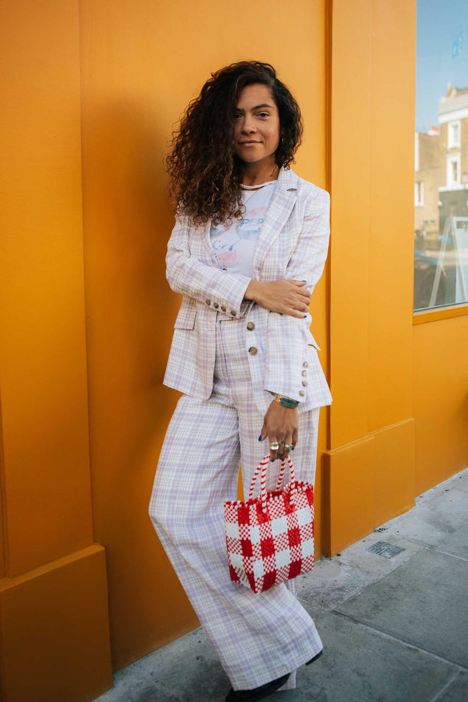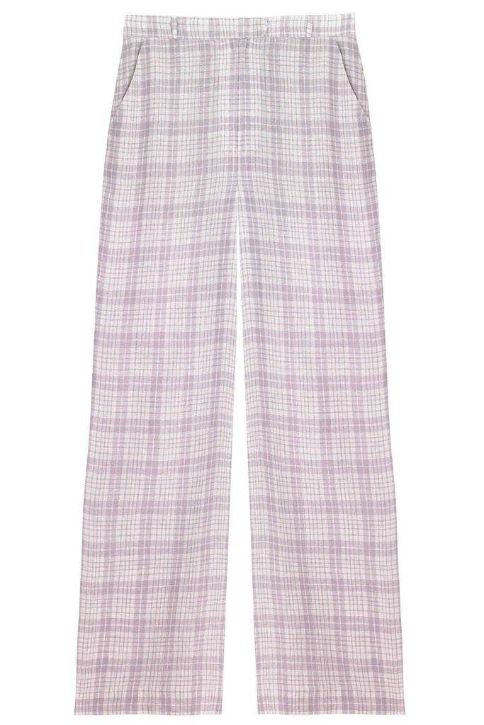Cut from of 100% Italian linen, these flattering high waisted, straight leg trousers are woven in an elegant lilac check pattern to elongate the leg.