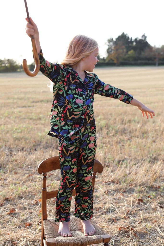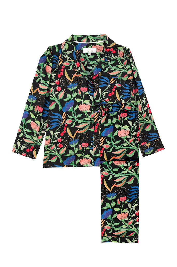 Our LiTTLE pyjamas get a floral updatethis season. Featuring a watercolour inspired print of brightly-hued wildflowers, our kids' Anaïs Black silk pyjamas are sure to be your LiTTLE one's favourite bedtime companion. Designed with a rounded collar matched with easy drawstring trousers, this set is beautifully finished with elegant tonal piping.